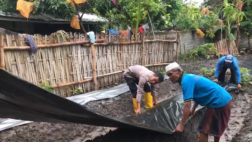 Lombok Timur –  Aiptu Lalu Indrawan Jaya Kusuma, Bhabinkamtibmas Desa Sukaraja Polsek Jerowaru Polres Lombok Timur, bersama Penyuluh Lapangan (PL) dan Kepala Desa, melaksanakan kegiatan pemupukan lahan dan pemasangan mulsa di area program ketahanan pangan di Desa Sukaraja, Kecamatan Jerowaru, Kabupaten Lombok Timur.