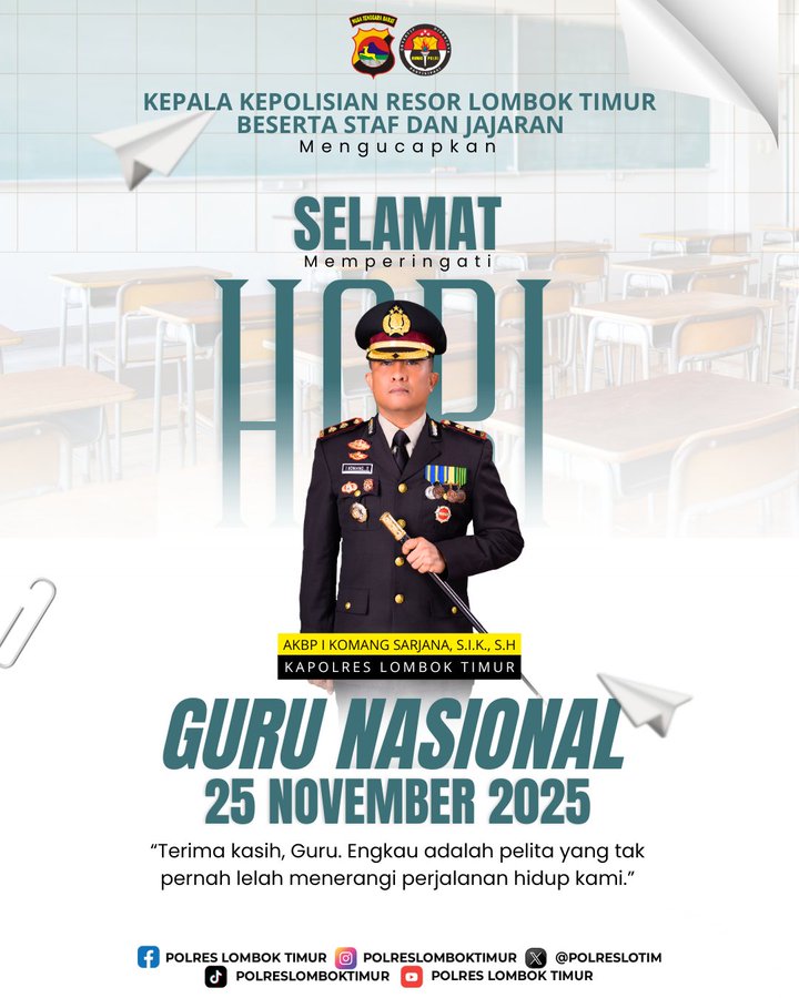 Lombok Timur – Kepala Kepolisian Resor (Kapolres) Lombok Timur, AKBP I Komang Sarjana S.I.K., S.H., menyampaikan ucapan selamat memperingati Hari Guru Nasional yang jatuh pada 25 November 2025. Melalui pesan resminya, Kapolres memberikan apresiasi mendalam kepada seluruh guru di Indonesia atas dedikasi dan pengabdian mereka dalam mencerdaskan kehidupan bangsa.