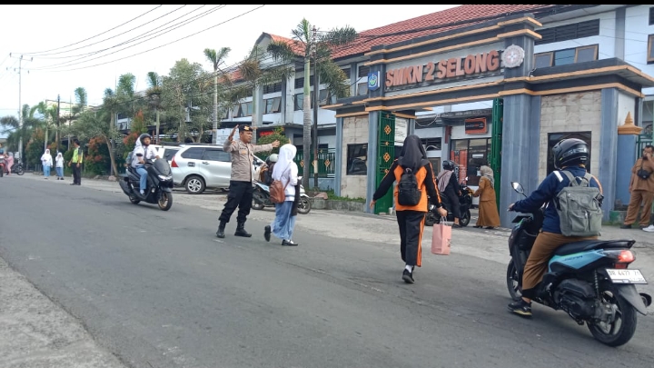 Selain melakukan pengaturan lalu lintas, personel Polsek Sukamulia juga membantu para siswa dan siswi SMKN 2 Selong saat menyeberang jalan. Langkah ini dilakukan sebagai bentuk antisipasi terhadap terjadinya kecelakaan lalu lintas, mengingat tingginya volume kendaraan pada pagi hari.