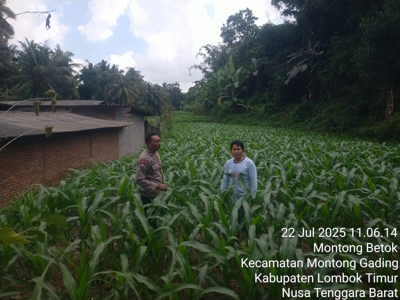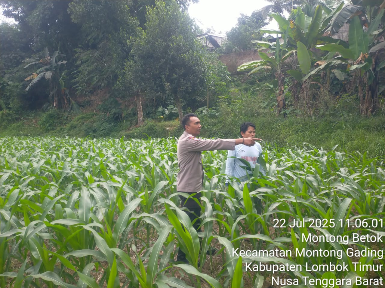 Lombok Timur– Dalam rangka mendukung Program Ketahanan Pangan Bergizi (P2B), Bhabinkamtibmas Desa Montong Betok, Polsek Montong Gading, Aipda Khurdianto melaksanakan kegiatan pengecekan dan pemeliharaan tanaman jagung di lahan milik warga binaan atas nama Suhatdi. Kegiatan ini berlangsung pada Selasa, 22 Juli 2025, pukul 11.00 Wita hingga selesai, bertempat di Dusun Gading, Desa Montong Betok, Kecamatan Montong Gading, Kabupaten Lombok Timur.