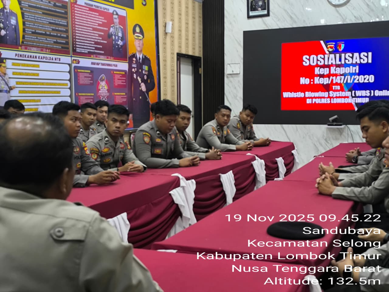 Lombok Timur – Kasi Propam Polres Lombok Timur AKP Arif Budiman, S.H memberikan sosialisasi terkait Keputusan Kapolri tentang Whistle Blower System (WBS) serta SP4N Lapor kepada seluruh anggota, bertempat di Ruang Patria Tama (Rupatama) Polres Lombok Timur pada Rabu, 19 November 2025.